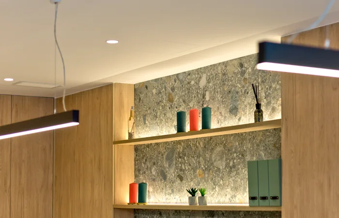 En esta ocasión hemos optado por una sencilla combinación de materiales y hemos añadido al espacio de trabajo conceptos de hogar, algo que reduce el aspecto técnico del conjunto y lo hace más acogedor.
